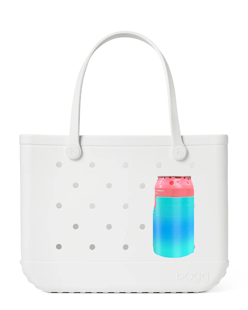 Elevate your bag with ease using this convenient cup holder. Compatible with Bogg Bags. No more rummaging through your bag for your drink - this cup holder fits seamlessly with any rubber tote bag that has holes. Crafted from durable plastic, it easily attaches through a rubber hole, similar to a charm. Its versatile design allows for placement on the inside or outside of your bag, accommodating water bottles, soda cans, and even a 14 oz Stanley Cup. Plus, it's a single, sturdy construction piece - no need to worry about separate parts. Bags sold separately.